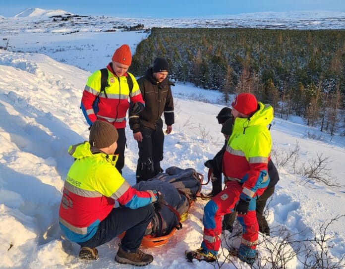 Hjálparsveitin Tintron í Grímsnesi fékk fyrsta útkall ársins í hádeginu í dag þegar aðstoða þurfti við sjúkraflutning vegna ferðamanns sem hafði dottið og slasast á göngu í kringum Kerið.