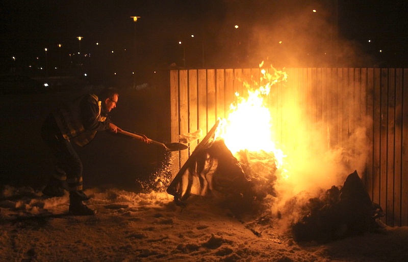 Eldurinn læsti sig í girðingu sem umlykur ruslatunnurnar en sjúkraflutningamenn, sem voru fljótir á staðinn, náðu að slá á eldinn með því að moka yfir hann snjó.