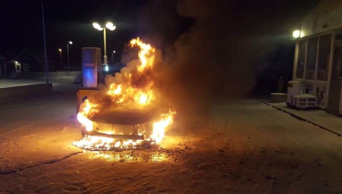 Talsverður viðbúnaður var viðhafður þar sem bifreiðin var upp við bensíndælu á bensínstöð.