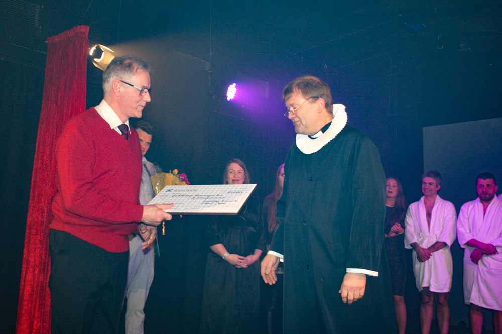 Daði Ingimundarson, formaður Lionsklúbbsins, afhenti leikfélaginu styrkinn og tók Hjörtur Benediktsson tók við honum af hálfu leikfélagsins.