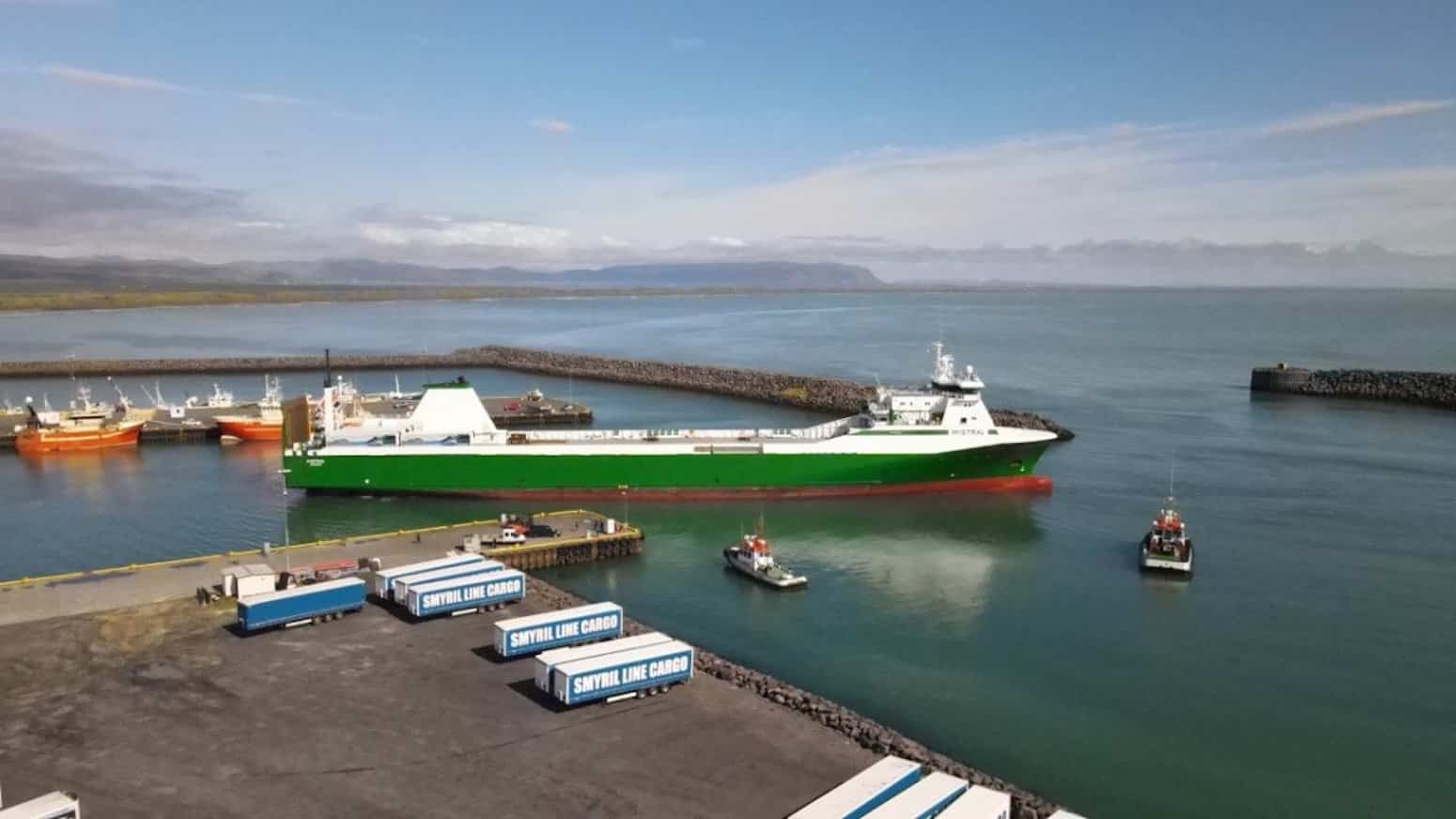 Nýtt skip Smyril Line Cargo, Mistral, kom í fyrsta skipti til Þorlákshafnar í dag. Skipið leysir Akranes af hólmi í farmflutningum til Þorlákshafnar.