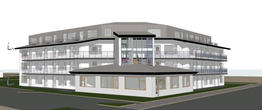 Þrjátíu stúdíóíbúðir við Eyraveg 26 á Selfossi eru nú komnar á sölu í húsi sem áður hýsti hótel og heimavist fjölbrautaskólans.