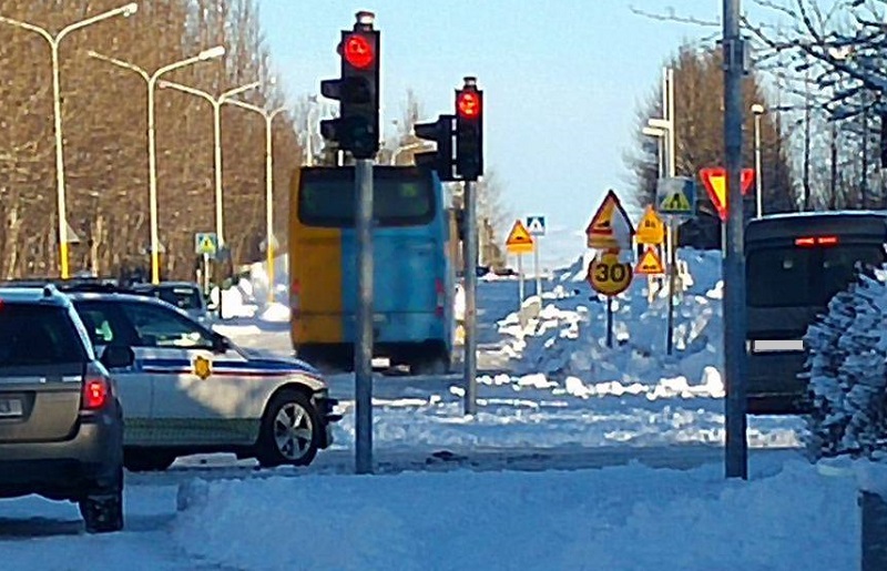 Lögreglubílnum var ekið suður Tryggvagötu með forgangsljósum og sírenu og þegar hann kom að gatnamótum Engjavegar og Tryggvagötu var rautt ljós á götuvita á umferð um Tryggvagötu.