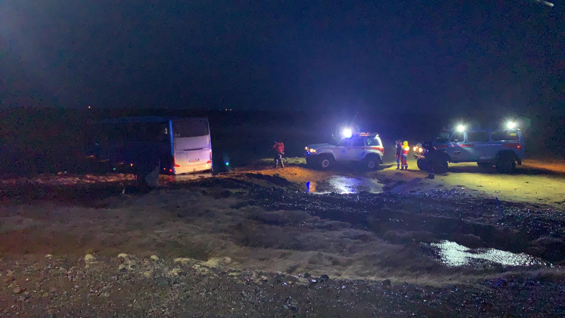 Eins og sunnlenska.is greindi frá fór rúta með 23 farþegum útaf veginum og endaði ofan í á en allir farþegarnir sluppu ómeiddir.