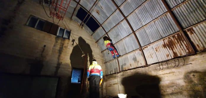 Þrír menn fóru í verkefnið og tókst að koma borðum og strekkjurum fyrir til að forða frekara tjóni.