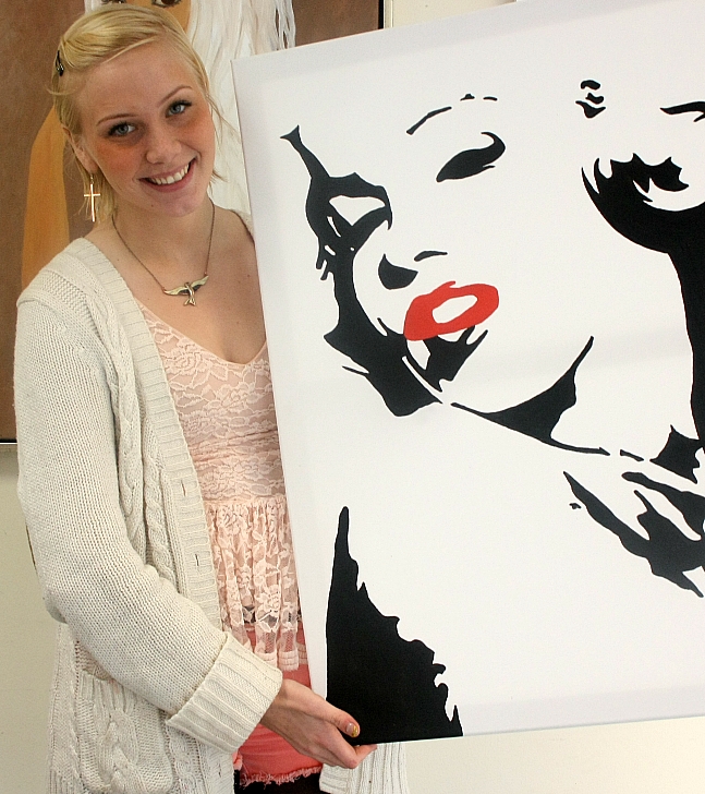 „Ég er að selja mest af myndum í stærðinni 60×80 sm. Þær kosta um 15.000 kr. og renna 5.000 kr. af hverri mynd til SOS barnaþorpanna. Í fyrra rakaði ég af mér allt hárið til styrktar ABC samtökunum og safnaði 646.000 kr. sem fór í það að byggja skóla fyrir krakkana í Kenya og núna hef ég ákveðið að styrkja SOS barnaþorpin,“ segir Erna Kristín sem stefnir á frekara myndlistarnám í Listaháskóla Íslands. Erna Kristín gerir alls konar stencil-myndir, þó að stencil-myndir af frægu fólki hafa verið hvað vinsælastar.