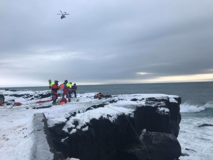 Fyrstu viðbragðsaðilar voru komnir á vettvang upp úr klukkan 12 og þá var ljóst að einn slasaður einstaklingur var í fjörunni neðan við háa kletta og mikil ísing á vettvangi. Björgunarsveitarfólk þurfti að síga niður til einstaklingins og hlúa að honum. Hann var svo hífður upp um borð í þyrlu Landhelgisgæslunnar um klukkan eitt.