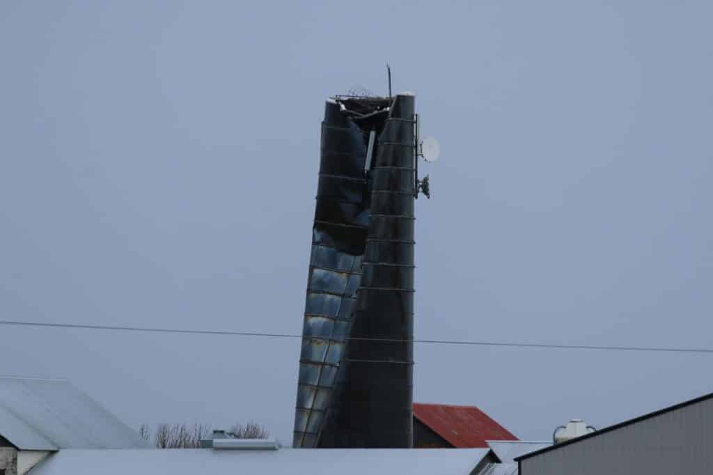 Súrheysturninn á Skíðbakka í Austur-Landeyjum stórskemmdist í óveðrinu í morgun. Hann hreinlega krumpaðist saman og er gjörónýtur.
