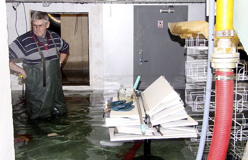 Útsláttur hafði orðið í vatnsdælum í brunni í kjallaranum og því flæddi grunnvatn um allan kjallarann. Þegar að var komið var vatnsdýptin um einn metri.