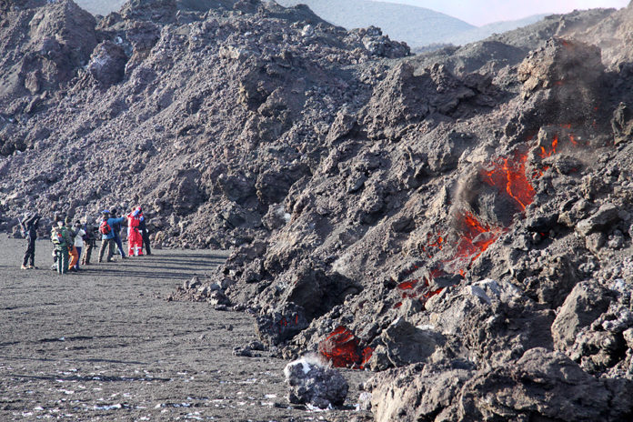 Þegar sunnlenska.is var á staðnum síðdegis í dag voru rúmlega 200 manns við hraunjaðarinn á Fimmvörðuhálsi. Flestir komu akandi með vélsleðum eða jeppum en fjöldi göngufólks var einnig töluverður. Dæmi eru um að fólk á gönguleiðinni upp Fimmvörðuháls hafi þurft að leita aðstoðar björgunarsveita og er eitt dæmi um einstakling sem varð örmagna og þurfti hjálp við að komast niður.