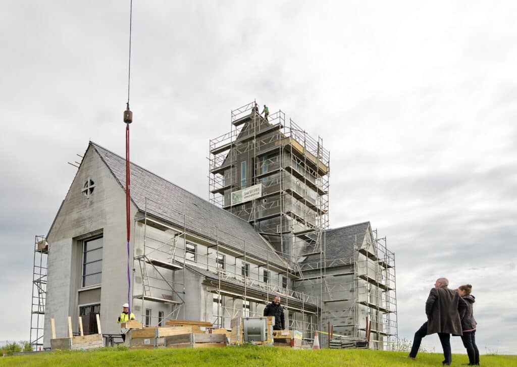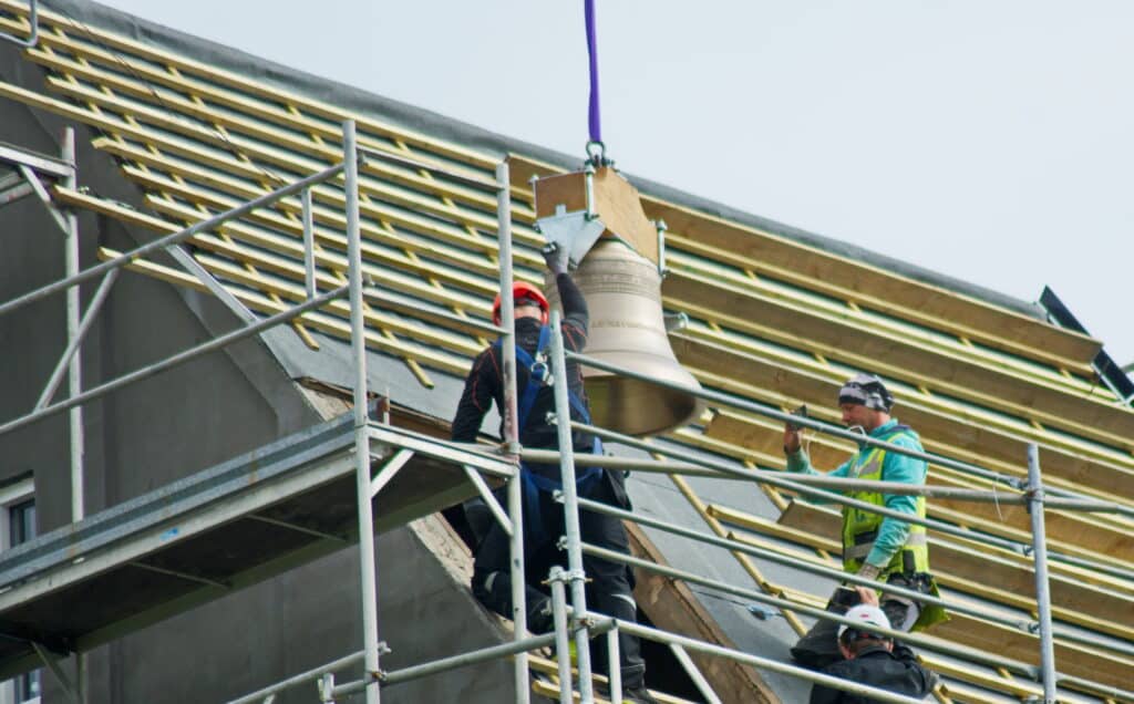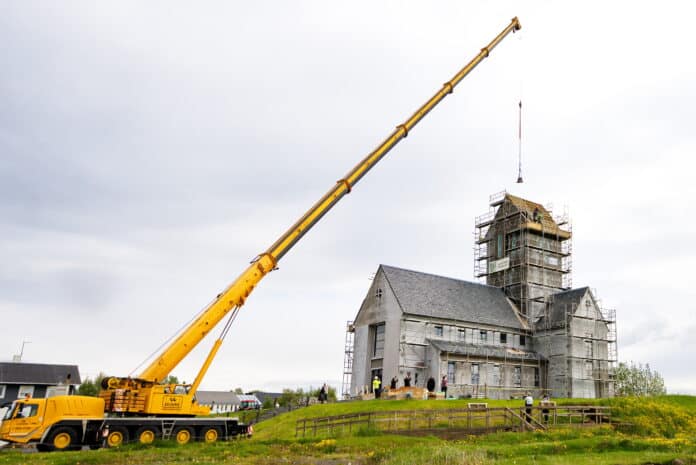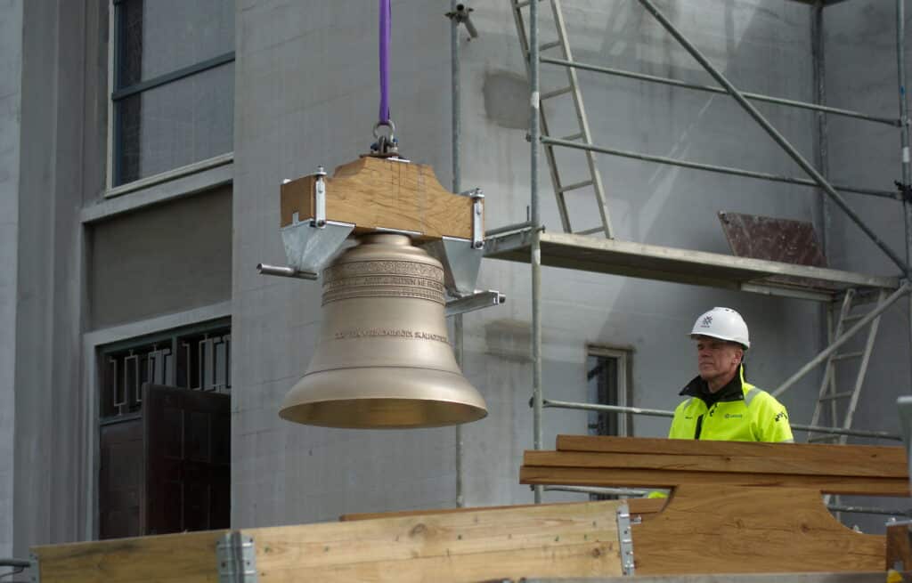Það var sögulegur dagur í Skálholti í dag þegar nýja danska kirkjuklukkan tók flugið með krana frá JÁVERK og sveif inn í turninn á dómkirkjunni.