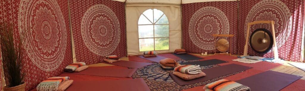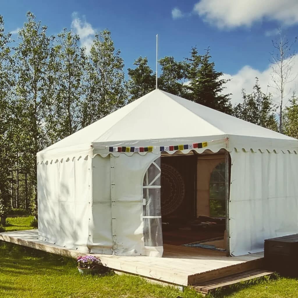 Námskeiðið er heima í sveitinni hjá Heiðu Björk í Grímsnesinu. „Ég flutti í sveitina fyrir fjórum árum til að elta uppi sveitakyrrðina og náttúruna. Ég er með jógatjald á túninu fyrir framan húsið. Þar held ég allskyns námskeið yfir sumartímann. Á veturna færi ég mig inn í hús og fæst við önnur verkefni eins og að fara með Íslendinga upp í fjöllin í Malaga eða halda hlédrag á hótelum hér í sveit fyrir útlendinga“