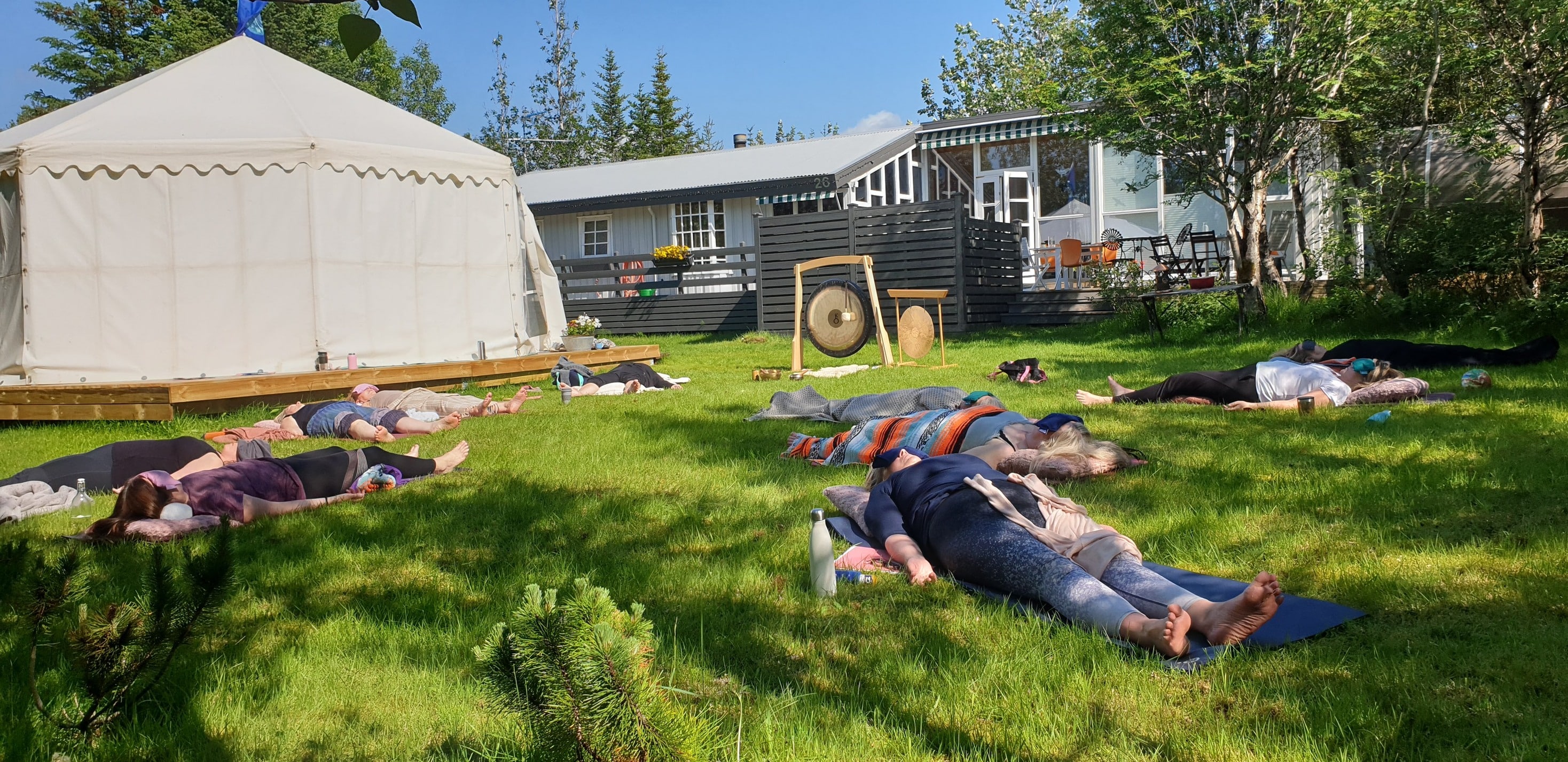 Námskeiðið er heima í sveitinni hjá Heiðu Björk í Grímsnesinu. „Ég flutti í sveitina fyrir fjórum árum til að elta uppi sveitakyrrðina og náttúruna. Ég er með jógatjald á túninu fyrir framan húsið. Þar held ég allskyns námskeið yfir sumartímann. Á veturna færi ég mig inn í hús og fæst við önnur verkefni eins og að fara með Íslendinga upp í fjöllin í Malaga eða halda hlédrag á hótelum hér í sveit fyrir útlendinga“