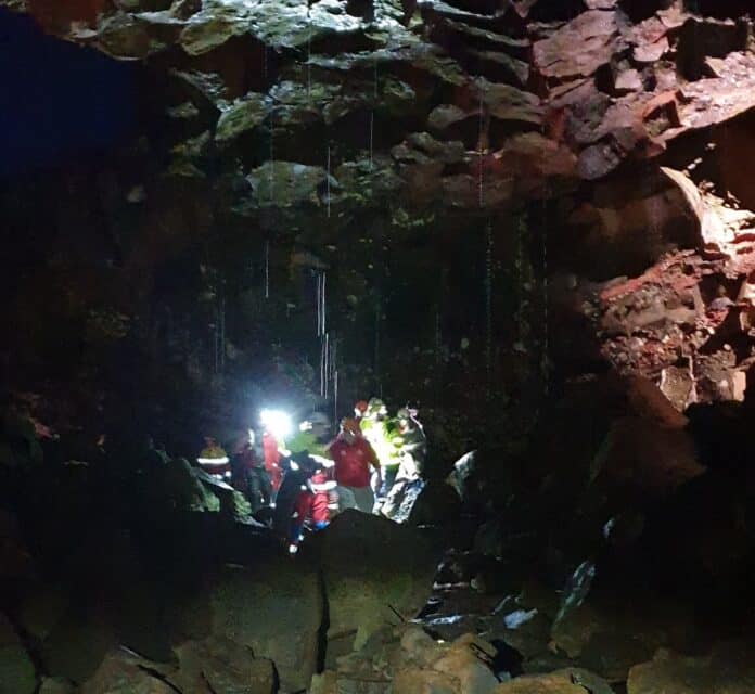 Leiðsögumaðurinn var með hópi ferðamanna í hellinum en fallið var um tveir metrar, niður í urð.