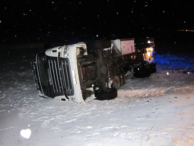 Að sögn lögreglunnar á Hvolsvelli var bílnum ekið í vestur og var hann með mjólkurtank í eftirdragi. Vagninn fór að rása í mikilli hálku með þeim afleiðingum að ökumaðurinn missti stjórn á bílnum sem hafnaði á hliðinni utan vegar. Nokkur þúsund lítrar láku úr mjólkurtanki bílsins.