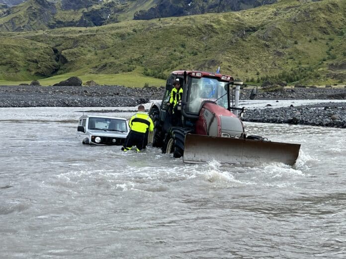 Björgunarsveitir komu á vettvang og festu spotta í bílinn þá var hægt að draga hann á land með dráttavélinni. Bíllinn var óökufær og mennirnir fengu far með björgunarsveitarbíl til byggða.