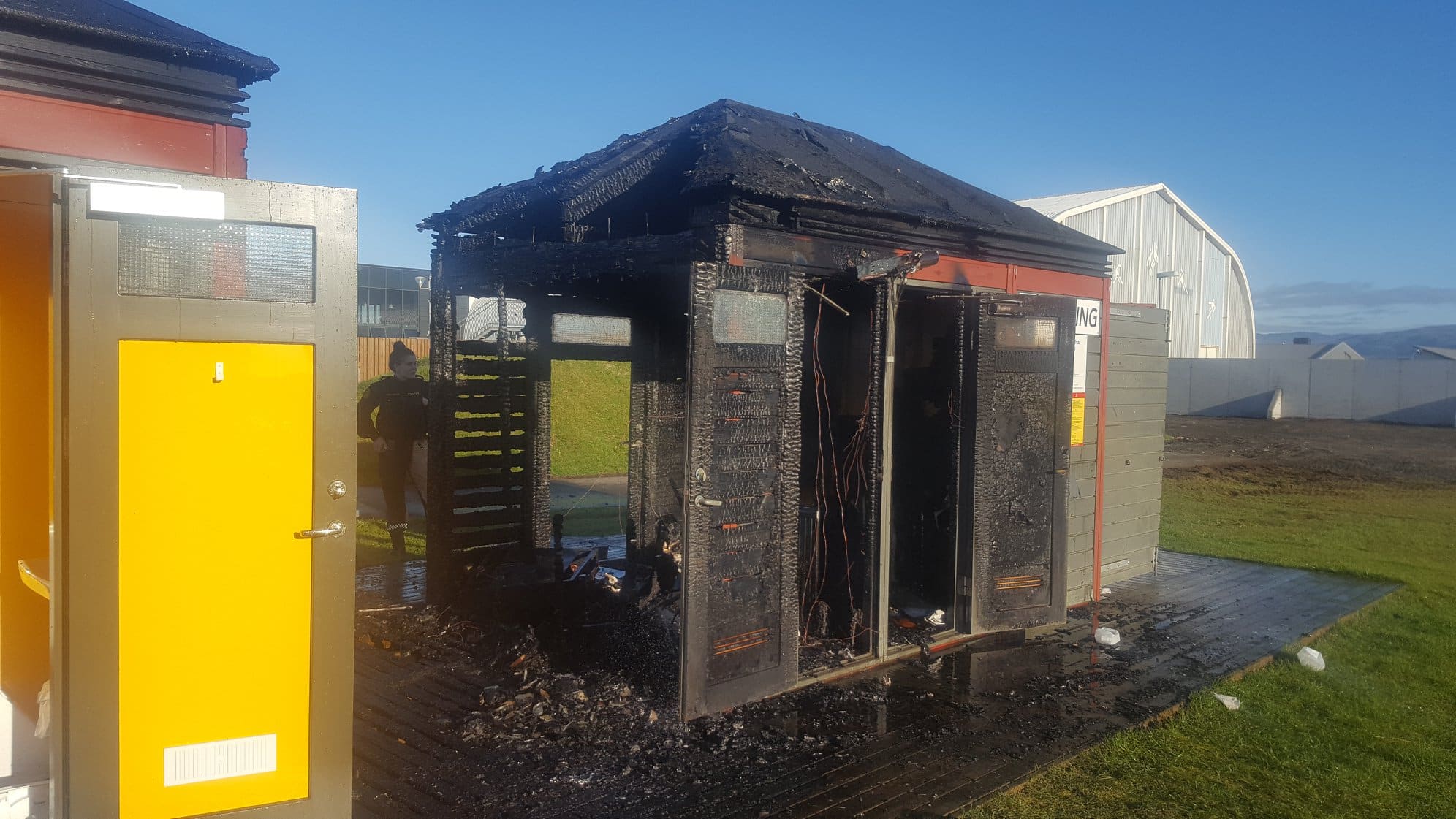Klukkan sex í morgun var tilkynnt um náðhús í ljósum logum á tjaldstæðinu í Þorlákshöfn. Húsið er gjörónýtt eftir eldinn.