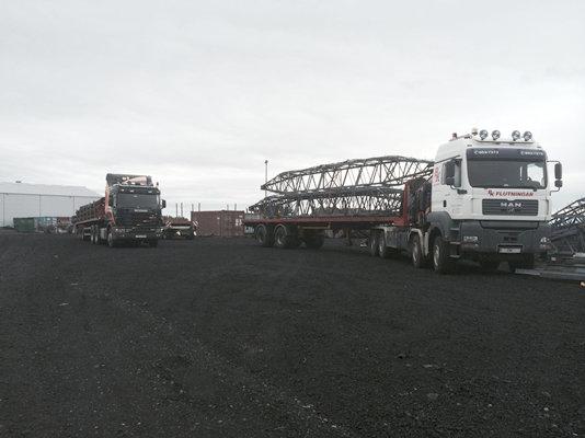 Fjórir vöruflutningabílar með neyðarbúnað til fyrstu viðbragðsaðgerða lögðu af stað frá lager Landsnets á Geithálsi í morgun með stefnu á Búrfell og Sultartanga. Á vögnunum eru stálturnar ásamt fylgibúnaði, tréstaurar og þverslár sem komið verður fyrir við tengivirki Landsnets við Sultartanga til að flýta fyrir viðgerð ef til þess kæmi að 220 kílóvolta (kV) háspennulínur Landsnets á þessu svæði gæfu sig í hamfaraflóði af völdum eldgoss.
