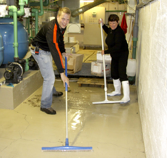 Þórdís Sigurðardóttir, forstöðumaður sundstaða Árborgar, var í óðaönn að skafa gólfið ásamt starfsmönnum sínum þegar sunnlenska.is bar að garði en að auki unnu starfsmenn Vatnstjóns.is að því að dæla vatninu í burtu.