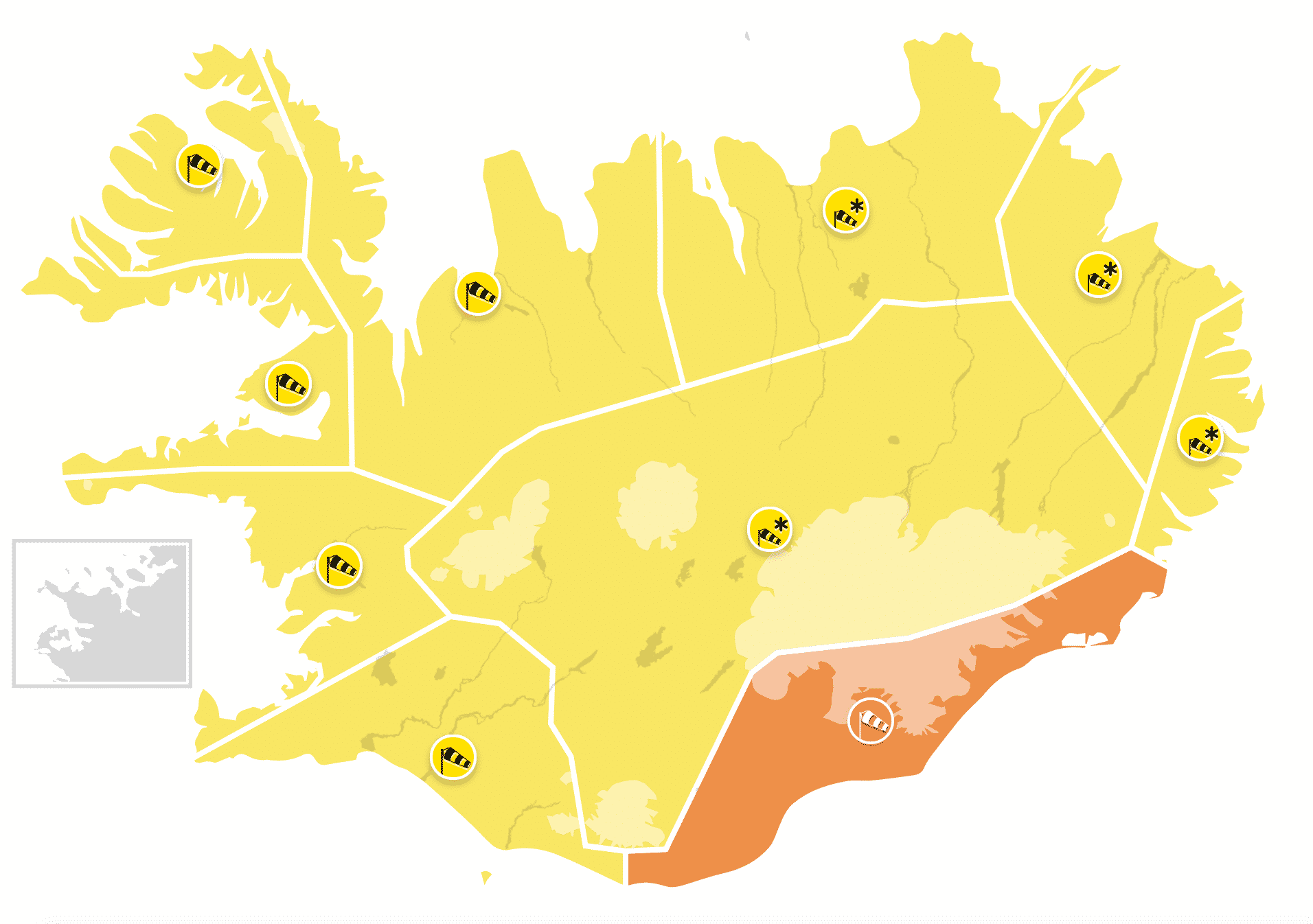 Á Suðausturlandi er appelsínugul viðvörun í gildi frá klukkan 7 að morgni nýársdags til klukkan 4 aðfaranótt sunnudags. Gert er ráð fyrir norðaustan 20-30 m/sek og hvassast í Öræfum og Mýrdal þar sem gert er ráð fyrir vindhviðum yfir 45 m/sek. Slydda eða snjókoma með lélegu skyggni og ekkert ferðaveður.