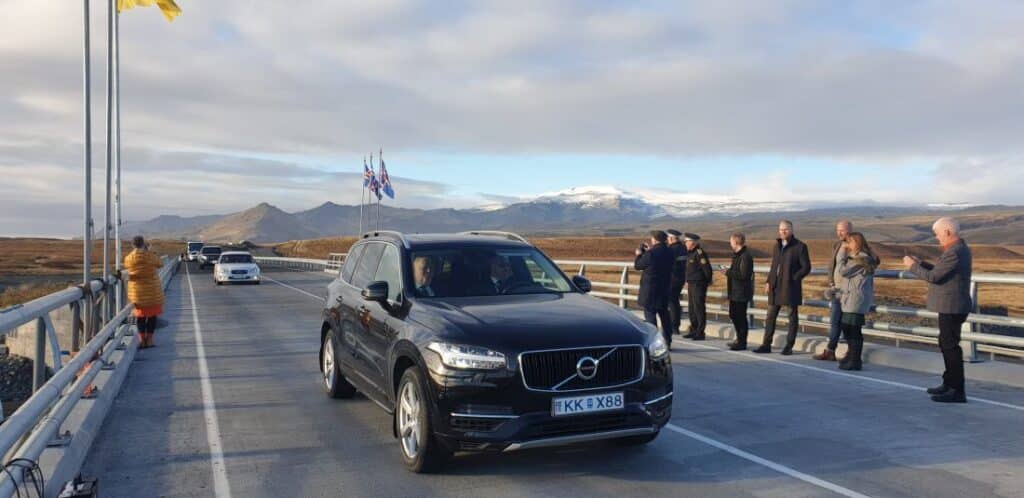 Að lokinni vígslunni ók Egill Magnússon, ráðherrabílstjóri, Sigurði Inga fyrstum yfir brúna en strax á eftir þeim kom Hörður Brandsson, sem fyrstur ók yfir brúna sem opnuð var árið 1967. Hörður er enn með sama bílnúmerið og var á bílnum sem ók yfir á sínum tíma, Z 25. Þess má geta að Hörður er sonur hins víðfræga Brands Stefánssonar eða Vatna-Brands sem var mikill brautryðjandi í samgöngumálum Vestur-Skaftfellinga. Hann keypti fyrst bíl árið 1927 og hóf stuttu síðar farþegaflutninga milli Víkur og Markarfljóts þar sem fólk var reitt yfir á hestum.