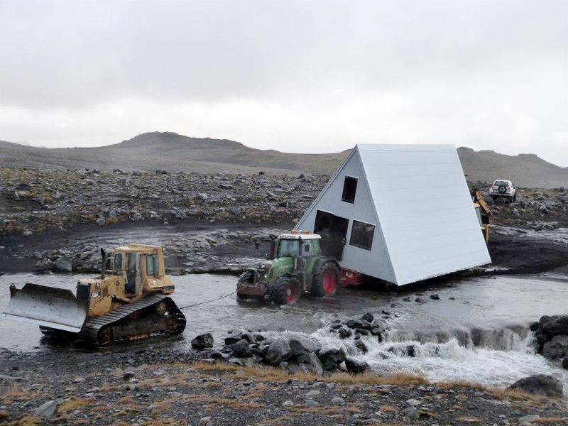Það var Stefán Helgason, húsasmiður í Vorsabæ í Flóa, sem smíðaði skálann fyrir FÍ og flutti upp á hálsinn á vagni ásamt vöskum flokki manna með nokkrum vinnuvélum. Flutningurinn var ekki átakalaus enda um torfærur að fara en alls tók 72 klukkustundir að koma húsinu frá Vorsabæ og upp undir hálsinn. Síðasti spölurinn, frá Skógum og uppeftir, hófst kl. 8 á laugardagsmorgun og húsið var komið á sinn stað kl. 2 aðfaranótt mánudags.