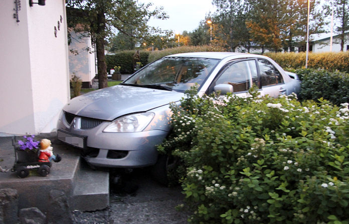 Fjölskylda við Dælengi á Selfossi vaknaði upp við mikla skruðninga í nótt og þegar að var gáð var bíll kominn alveg að útidyrunum.
