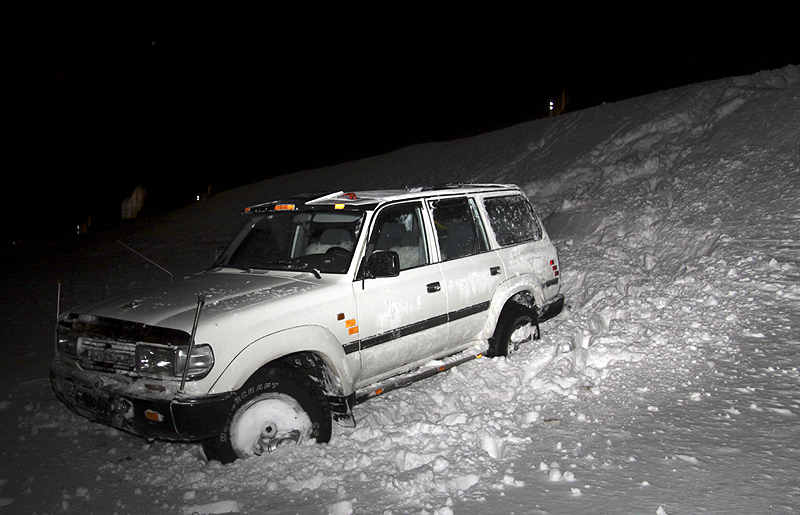 Bíllinn virðist ekki mikið skemmdur enda djúpur snjór utan vegar.