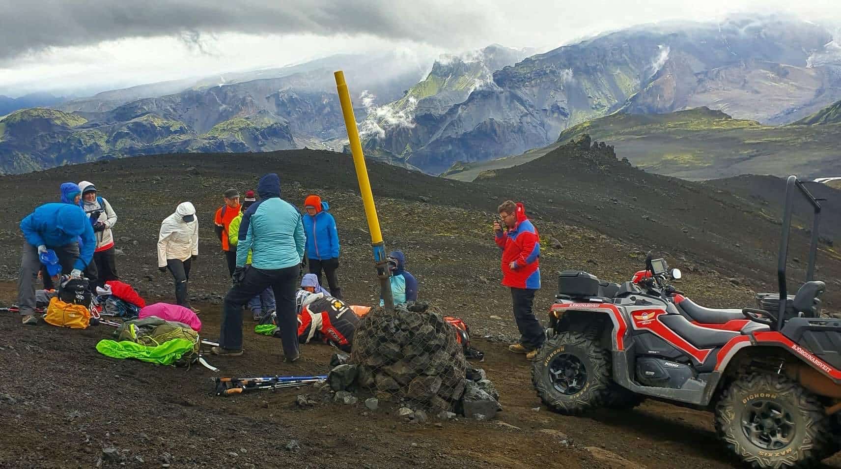 Á svæðinu var lágskýjað og mikill vindur og var hópurinn staddur í lægð þar sem var lélegt símasamband og gekk brösuglega að fá upplýsingar í fyrstu. Fljótlega kom þó í ljós að líðan konunnar var verri en talið var, hún var mikið verkjuð og orðin köld og hrakin.
