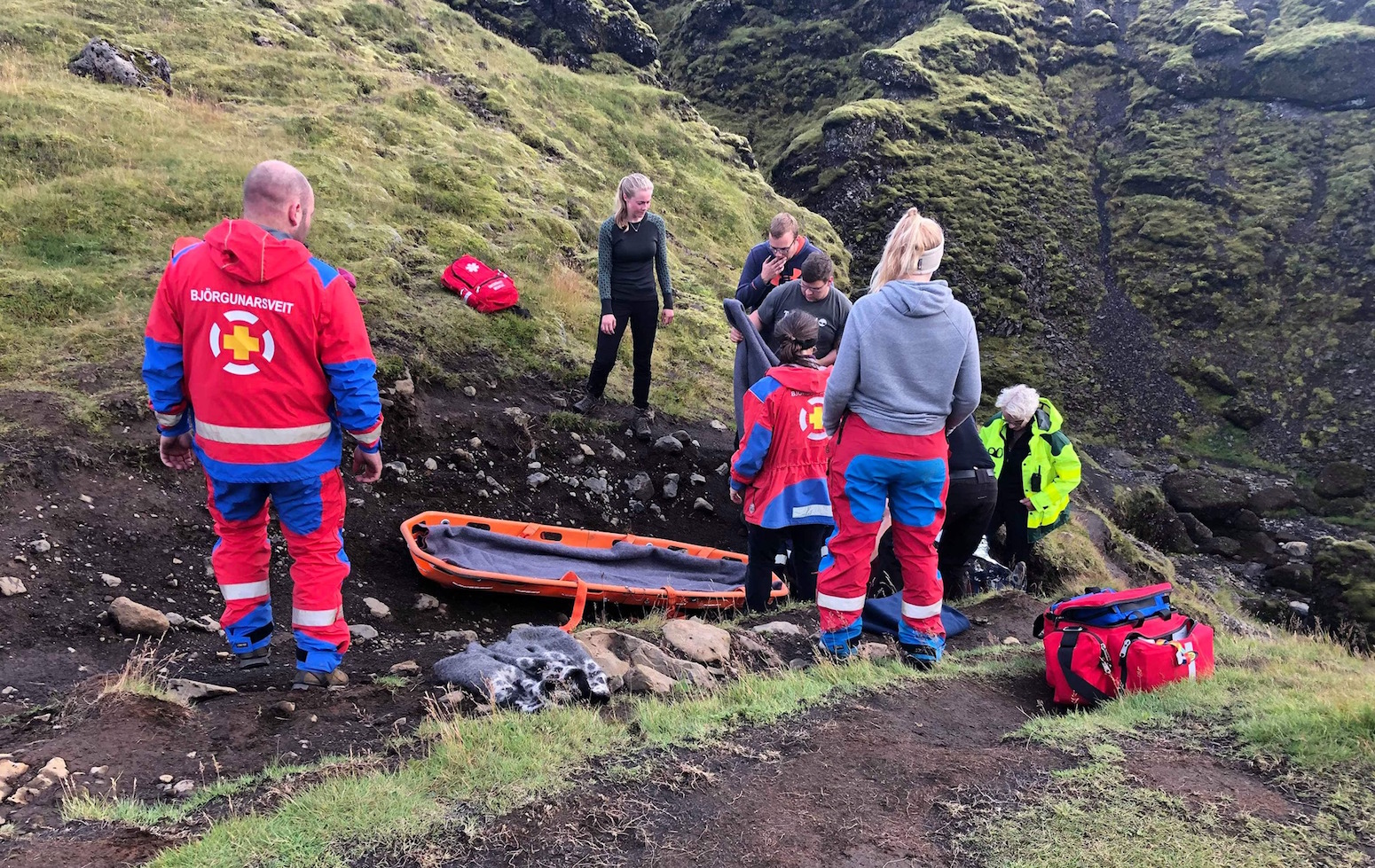 Kalla þurfti út björgunarsveitir sem báru konuna rúman kílómetra á börum og komu henni um borð í sjúkrabíl í Skógum, þaðan sem hún var flutt á sjúkrahús.