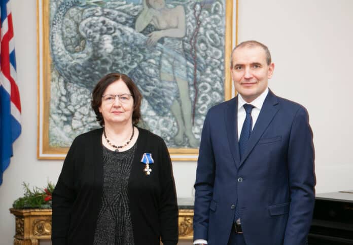 Ólafía Jakobsdóttir, fyrrverandi sveitarstjóri í Skaftárhreppi, var ein tólf Íslendinga sem í dag voru sæmd heiðursmerki hinnar íslensku fálkaorðu við hátíðlega athöfn á Bessastöðum.
