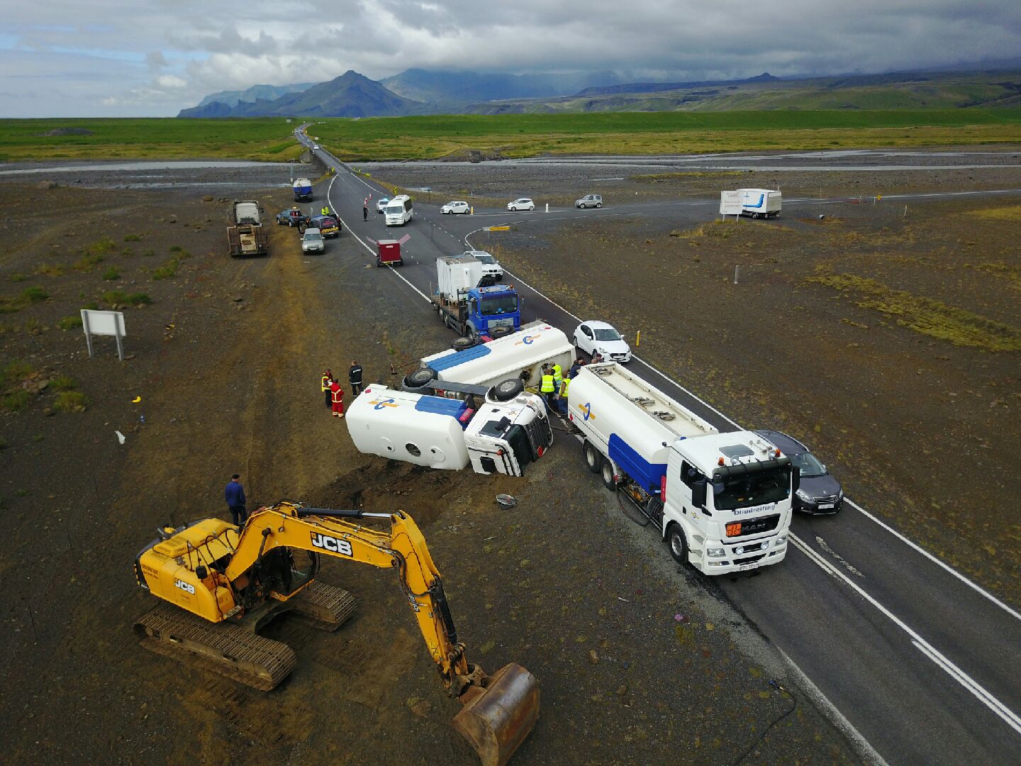 Einhver slys eru á fólki og þá lekur olía úr olíuflutningabifreiðinni. Lögreglan á Suðurlandi getur ekki gefið frekari upplýsingar að svo stöddu.