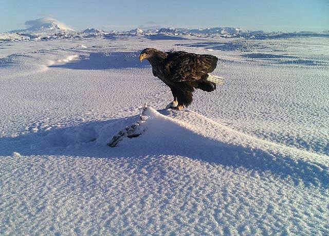 Það er margt að sjá í myndavélinni og eins og sjá má eru það ekki bara refir sem kroppa í hrossakjötið frá Magnúsi. Þessi glæsilegi örn sat þar í mestu makindum og gæddi sér á kræsingunum.