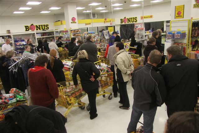 Búðin fylltist strax af fólki sem kepptist við að gera góð kaup og fljótlega mynduðust raðir af fólki sem biðu eftir innkaupakörfum. Sumir björguðu sér reyndar og söfnuðu vörum í mjólkurgrindurnar sem tæmdust fljótt í kælinum.