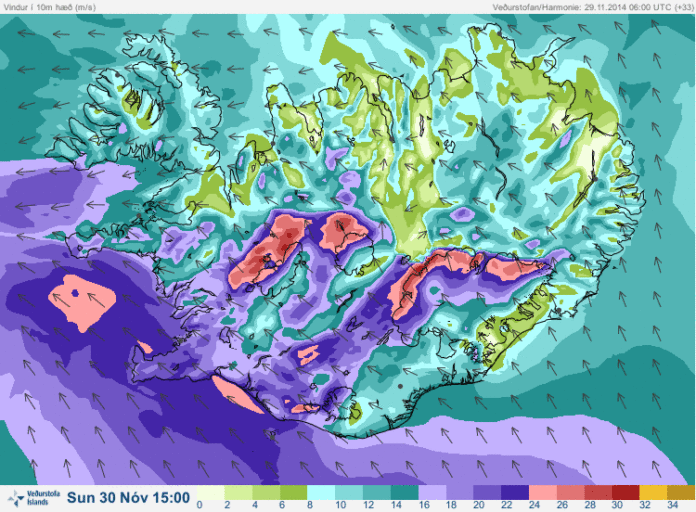 „Útlit er fyrir að mjög djúp og kröpp lægð fari skammt fyrir vestan land þótt vissulega sé heldur snemmt að geta sér til um nákvæman ferli lægðarmiðjunnar. Dýpt lægðarinnar, lögun og ferill ráða vitaskuld mestu um hversu slæmt veðrið verður. Talið er líklegast að eftir miðjan dag á morgun gangi í SA storm og jafnvel ofsaveður með slyddu og rigningu á láglendi, en snjókomu til fjalla. Um kvöldið og nóttina snýst síðan í skammvinna en harða SV-átt um allt land. Veðurhæðin verður hvað mest vestan- og norðvestantil. Um leið kólnar aftur með slyddu og síðar éljum.“