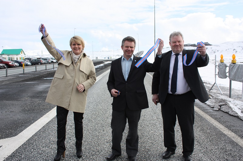 Ráðherrarnir Sigurður Ingi Jóhannsson og Ragnheiður Elín Árnadóttir, ásamt Gunnari Þorgeirssyni, formanni Samtaka sunnlenskra sveitarfélaga klipptu á borða á Suðurlandsveginum við Litlu kaffistofuna í dag og opnuðu þar með formlega Leyndardóma Suðurlands.