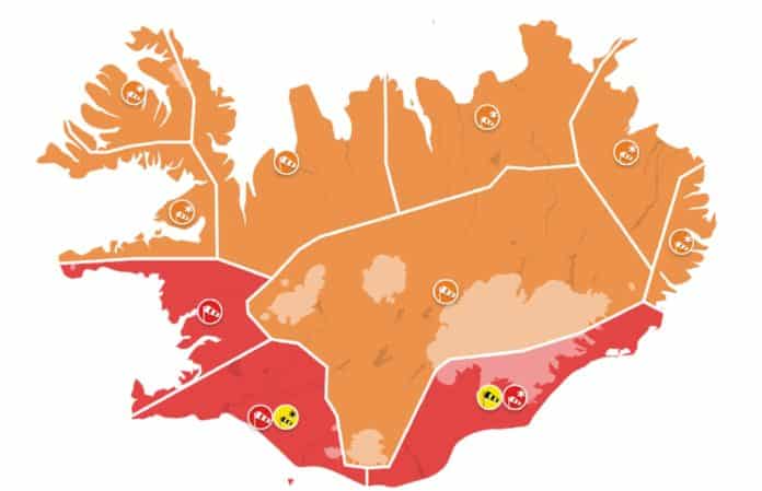 Gul viðvörun er í gildi frá kl. 22 í kvöld og fram yfir miðnætti. Frá kl. 1 í nótt til kl. 5 er í gildi appelsínugul viðvörun, og aftur er appelsínugul viðvörun að liðinni þeirri rauðu frá hádegi á föstudag til kl. 14. Eftir það er í gildi gul viðvörun frá kl. 15 á morgun til kl. 6 á laugardagsmorgun.