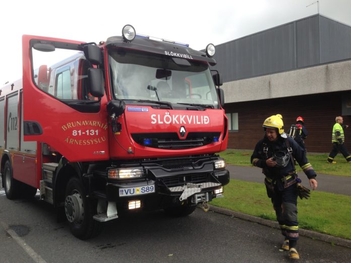 Smávægilegur eldur var í tölvuherberginu og voru upptök hans sennilega í kælikerfi við viftu á útvegg herbergisins.
