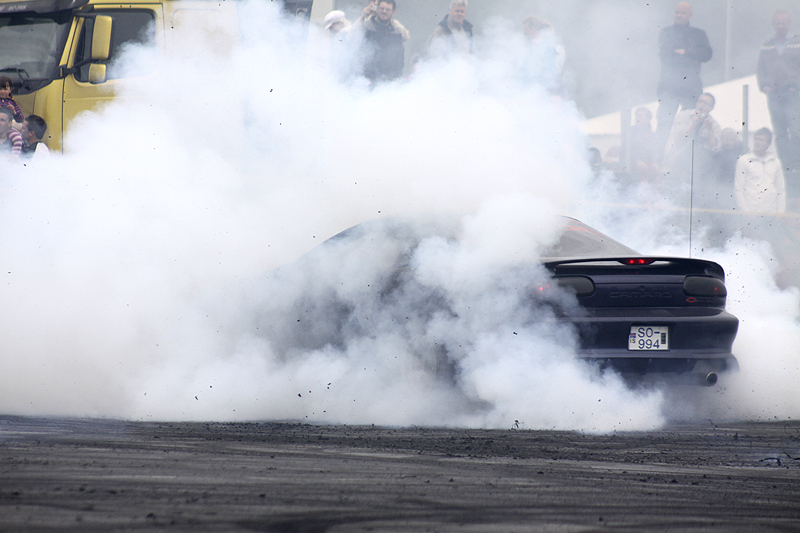 Hann var þegar búinn að marka svarta hringi í malbikið og mynda mikinn reyk, þegar lögreglu bar að. Brot hans varðar fjórðu grein umferðarlaga, sem meðal annars tekur til hávaðamengunar í umferðinni.