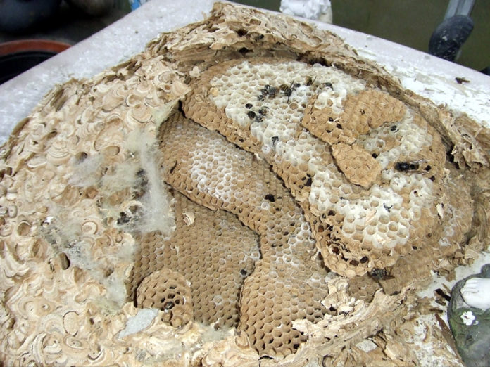 Verið var að skipta um klæðningu á bílskúrsþakinu þegar smiðirnir komu niður á búið sem er 42 sentimetrar þar sem það er breiðast og 15 sm þykkt. Þetta er sannkallað fjölbýlishús, með rúmgóðum kjallara og glæsilegri þakíbúð. Útveggirnir eru eins og fallega skreytt marengsterta.