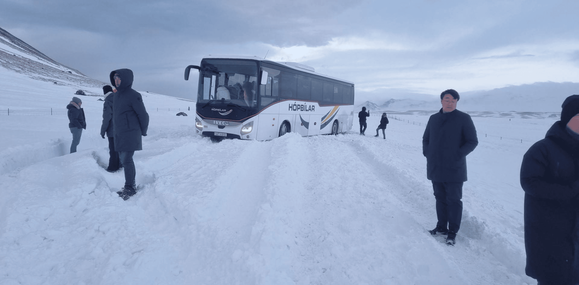 UPPFÆRT KL. 20:48: Rútan var losuð með stórvirkum vinnuvélum. Bílstjórinn hélt áfram akstri á lokuðum vegum og festi rútuna aftur. Nú situr hún þversum á veginum að Hótel Dyrhólaey. Fjöldi bílstjóra hefur virt lokunarpósta að vettugi í dag og hafa þeir lokunarpóstar nú verið mannaðir af lögreglu.