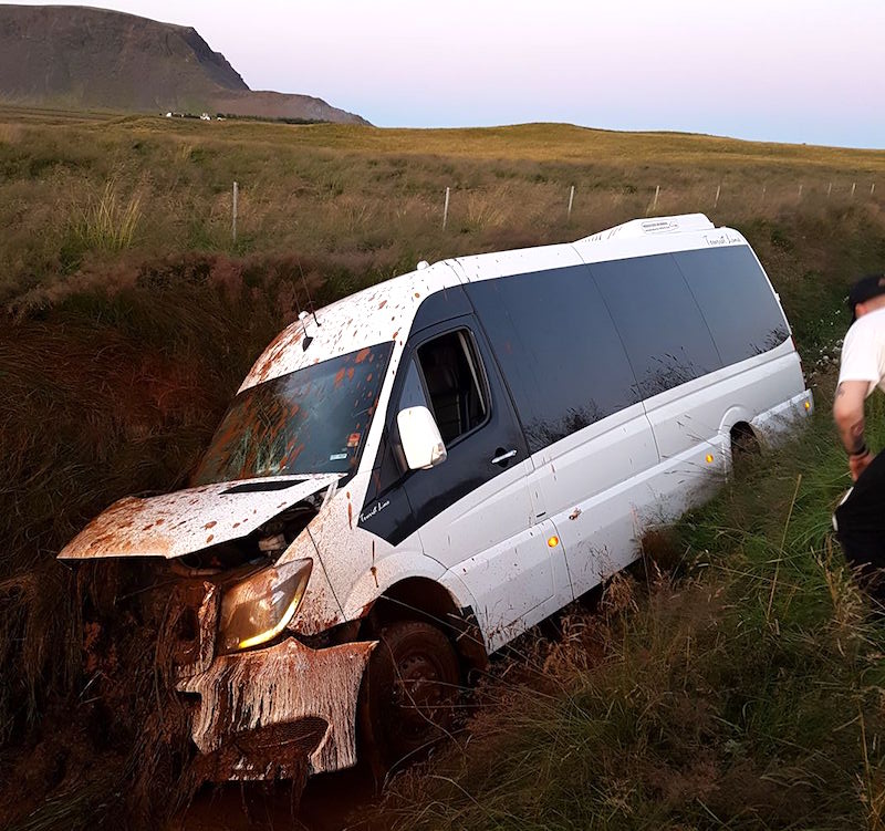 Fimm erlendir ferðamenn sem einnig voru í bílnum sluppu án teljandi meiðsla þrátt fyrir að talsvert högg hafi komið á bílinn þegar hann lenti í skurðinum. Lögreglan telur að farþegarnir hafi allir verið í öryggisbeltum.