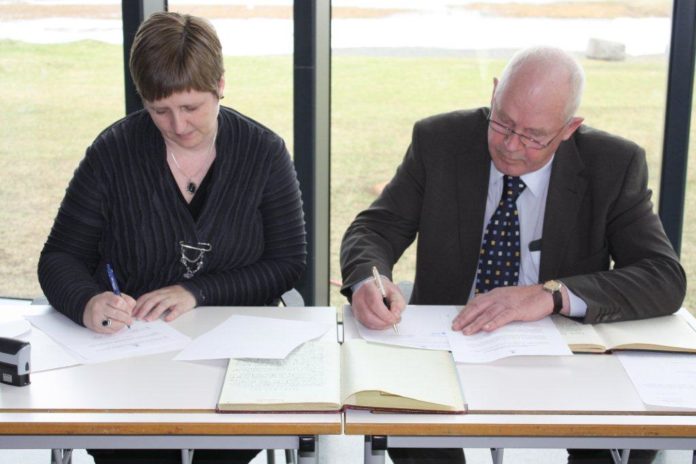 Það voru Ásta Stefánsdóttir, frá Grund, framkvæmdstjóri Sveitarfélagsins Árborgar og Siggeir Ingólfsson, frá Syðra-Seli, formaður Stokkseyringafélagsins sem undirrituðu samninginn í nýja barnaskólanum á Stokkseyri.