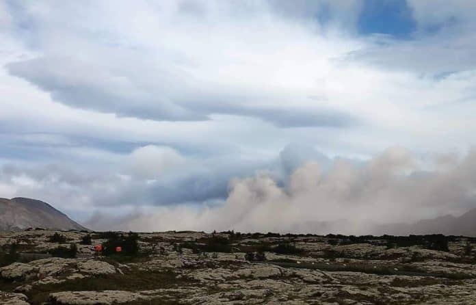 Á Facebooksíðu Þjóðgarðsins á Þingvöllum eru birtar myndir af vatninu þar sem jarðvegurinn á botni vatnsins bókstaflega fýkur burt í snarpri norðanáttinni eftir viðvarandi þurrkatíð svo af verður mikið sjónarspil.