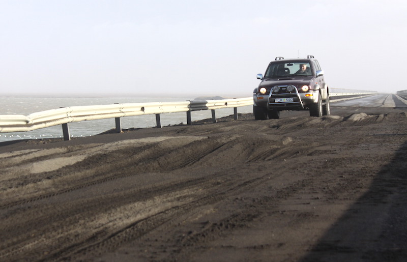Við vesturendann voru sandskaflar á veginum og austan megin var klæðning byrjuð að losna af veginum við brúarsporðinn.