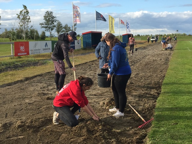 Þetta er ekki í fyrsta skipti sem sjálfboðaliðar taka til hendinni á íþróttavellinum á Hvolsvelli í sumar. Í júlí brettu skátar upp ermarnar og kantskáru völlinn og hreinsuðu torfið eftir að bæjarstarfsmenn höfðu plægt hann.