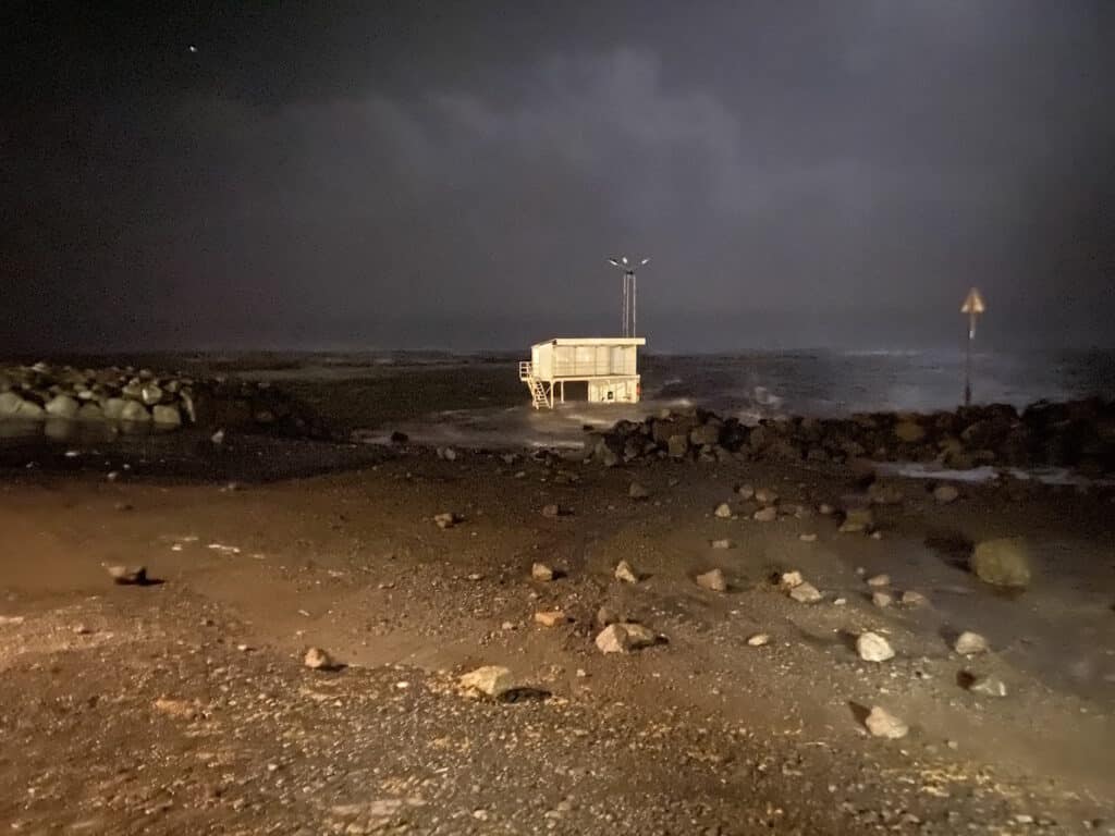 Á Eyrarbakka hefur sjór gengið langt upp á land, yfir sjóvarnargarðinn meðal annars við björgunarsveitarhúsið og Skálann.