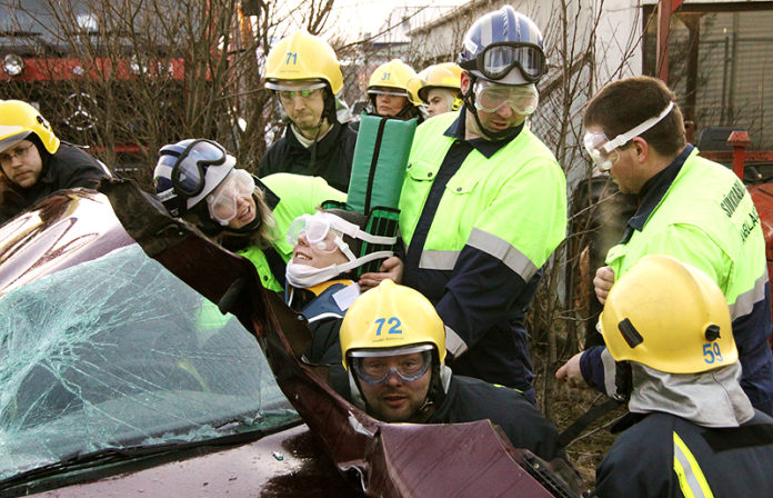 Kennslan hefur farið fram í fyrirlestrasal Heilbrigðisstofnunar Suðurlands á selfossi en í kvöld var verkleg æfing í samvinnu við Brunavarnir Árnesinga þar sem sviðsett var umferðarslys og bjarga þurfti sex slösuðum úr tviemur bílum.
