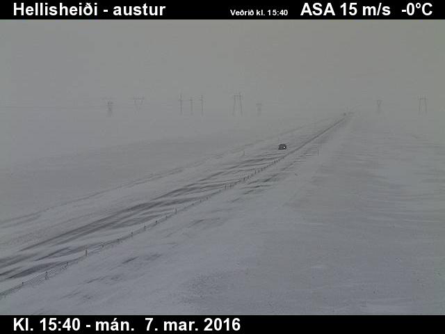 Skrifað kl. 15:44: Á Hellisheiði og í Þrengslum er versnandi veður. Frá hádegi og fram undir kl. 18-19 er reiknað með 15-18 m/s, hríðarveðri og skafrenningi. Einnig á Mosfellsheiði og á Lyngdalsheiði. Skil koma úr suðvestri og með þeim hlýnar lítillega. Á láglendi hlánar og þar verður slydda eða rigning en ofan um 150-200 m verður hríðarveður suðvestan- og vestanlands.