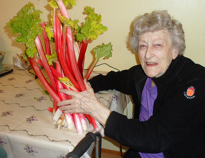 „Ég hef aldrei séð þetta fyrr,“ segir Guðrún Helga Þórisdóttir í Skeiðháholti á Skeiðum en hún gerði sér lítið fyrir á þriðjudag og skar reiðinnar bísn af fallegum rabarbara í garðunum hjá sér.